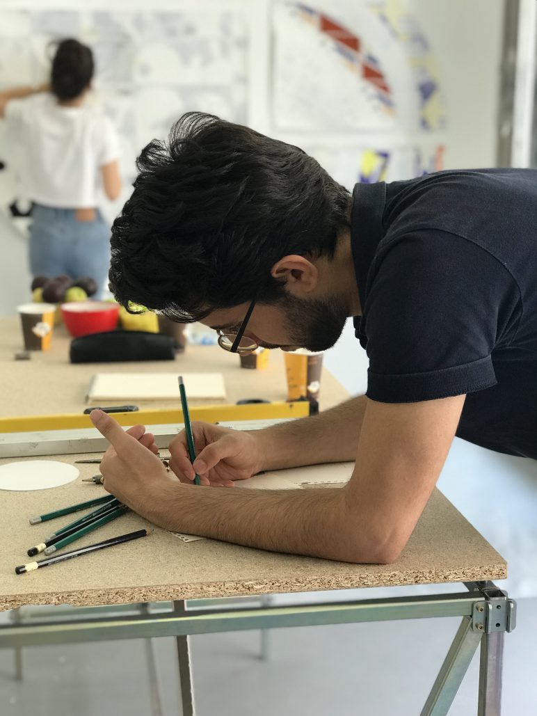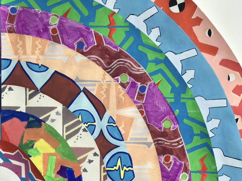 The School will produce a series of circular paintings on paper using these earthquake vectors and symbols to make repeating patterns over their surface. The circular paintings will decrease in size, creating concentric rings like those of an earthquake ’s epicentre, spreading outwards. The works will be overlapped, showing just the edges of each previous layer, as a process-based concept of painting, and covering, layering as a form of dialogue.